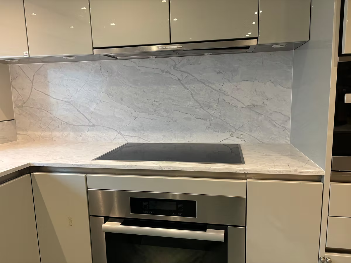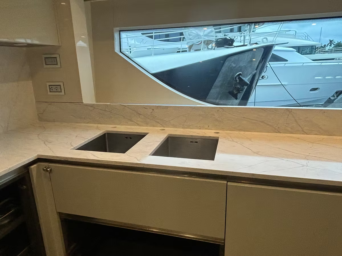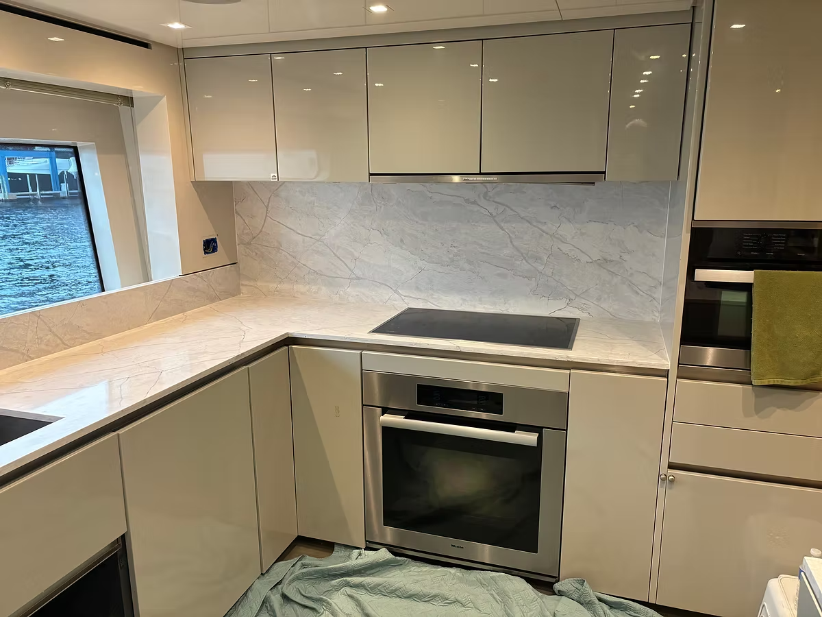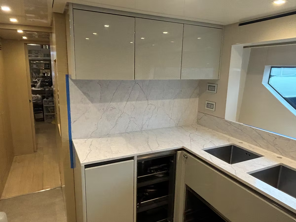 We did this update to the countertops and full backsplashes in the galley of this beautiful 126′ long San Lorenzo Yacht, the material chosen was Augusta Bay from UMI Quartz.