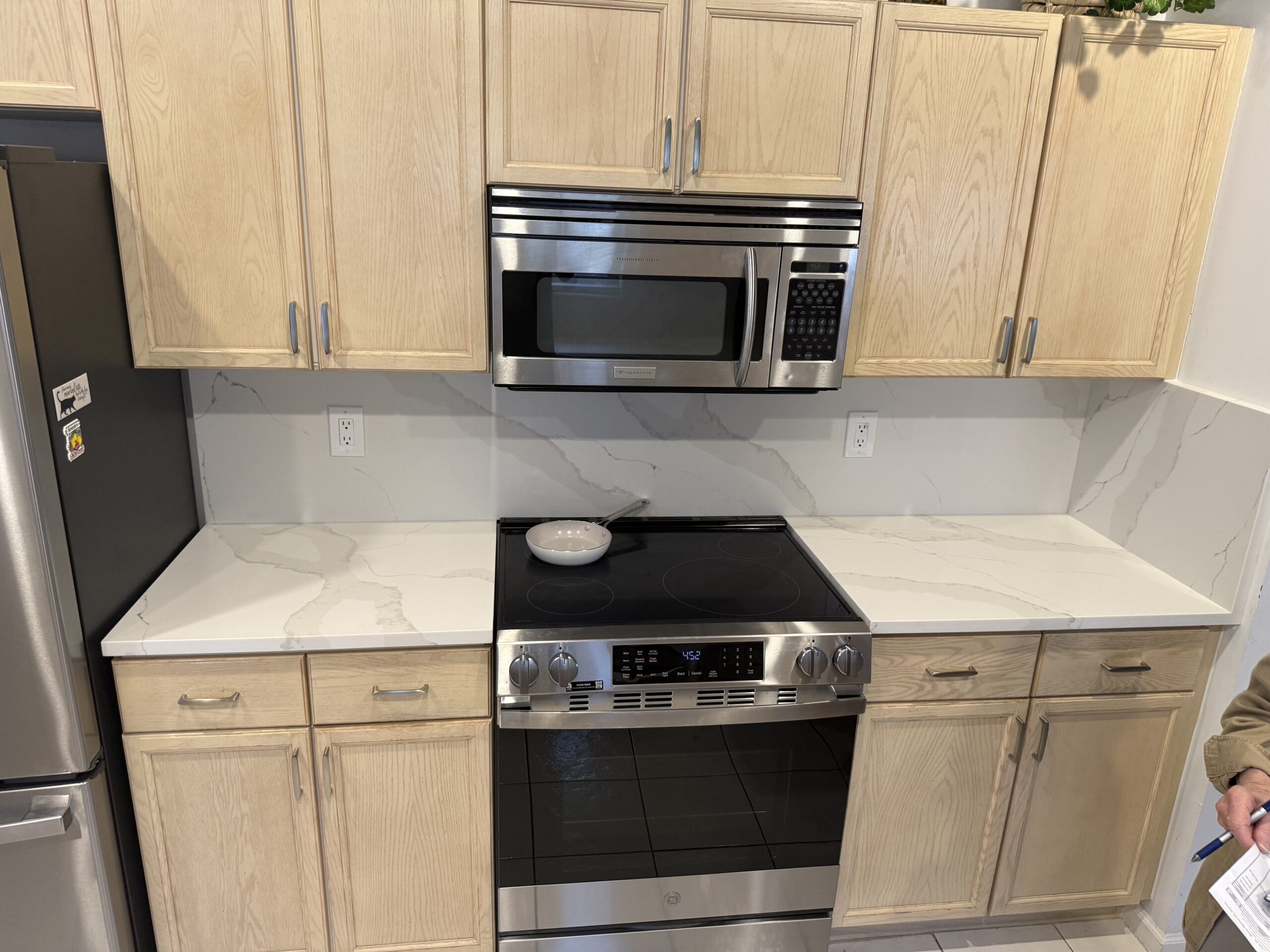 The natural gold and gray veining flows gracefully across the polished 3 cm surface, paired with a smooth eased edge for a refined, modern look. This cohesive design enhances the kitchen’s visual appeal while offering the durability and low maintenance expected from high-quality quartz surfaces.