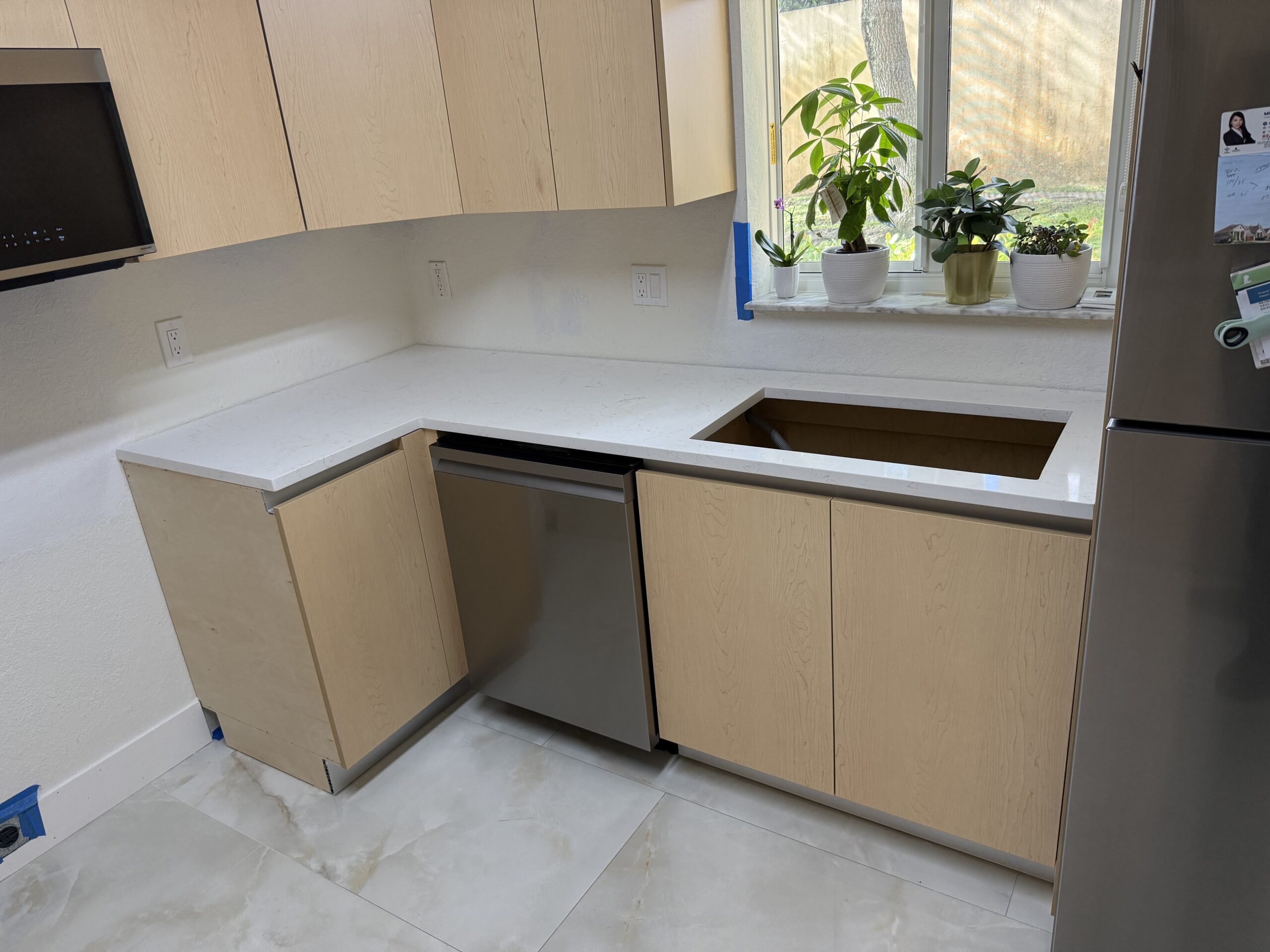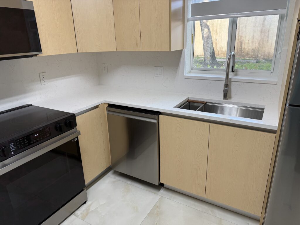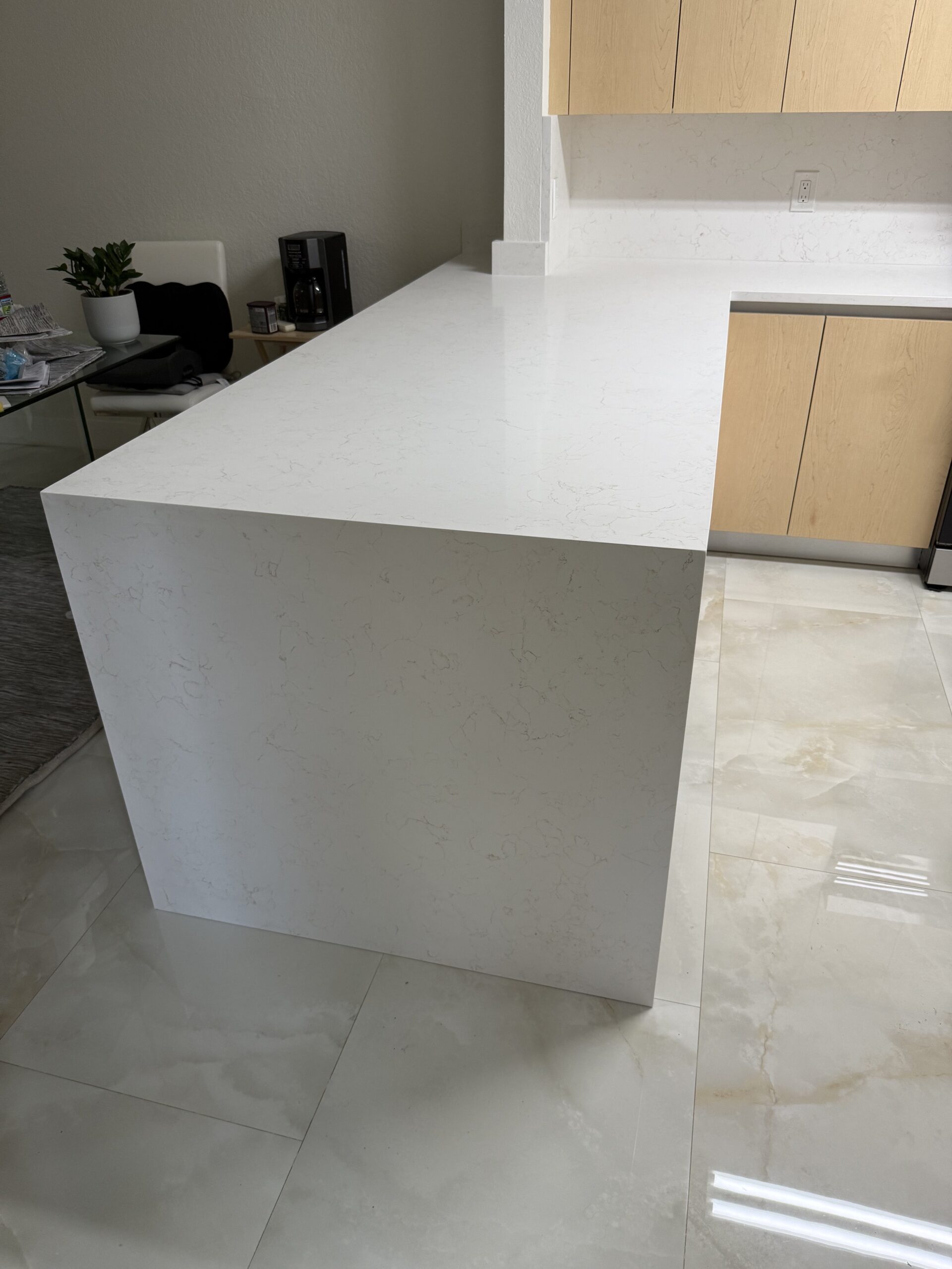 In this modern kitchen in Sunrise, Florida, Stone and Quartz fabricated and installed Carrara Abraba Gold countertops, including a sleek waterfall panel that adds a strong, contemporary touch. The straight edge profile keeps the design clean and minimal.
