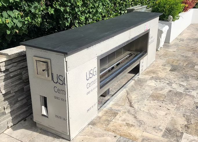 In this outdoor Fireplace in Boca Raton, Fl, we fabricated and installed Dekton countertops with a straight edge.