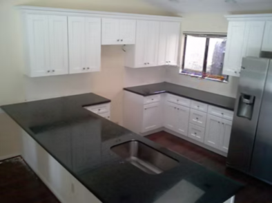 In this granite kitchen countertop, we fabricated and installed granite countertops with a bullnose edge and an under mount sink. This was installed in Wellington, Florida.